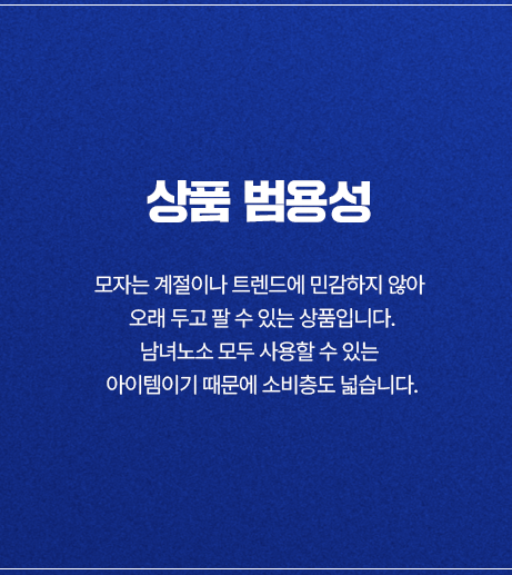 모자 시장은 규모는 작지만 유행을 타지 않아 안정적인 수요를 유지합니다.